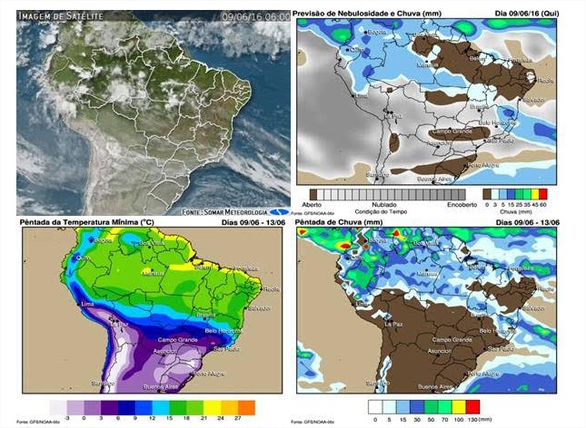 Já em toda a metade sul do Brasil, o tempo permanecerá aberto e sem previsões para chuvas, pelo menos até meados da semana que vem, quando a massa de ar polar começará a perder forças.