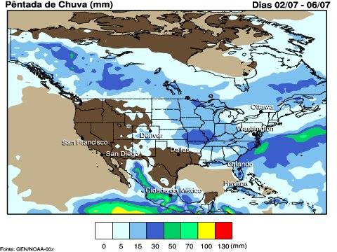 Para os Estados Unidos a semana será chuvas em todas as regiões produtoras de grãos, em especial sobre a região do meio-oeste, porém os volumes serão baixos, sendo previsto ao longo dessa semana, valores inferiores a 50 mm. As temperaturas, principalmente as máximas continuarão acima da média para o período. Mas mesmo com temperaturas altas, as ocorrência de pancadas de chuvas possibilitarão condições razoáveis ao desenvolvimento das lavouras de soja, milho e algodão. Não sendo previstos quebras de produtividade significativas ao longo dessa semana.