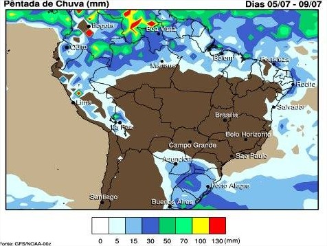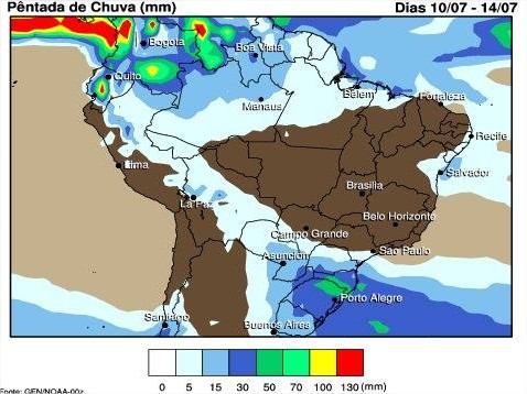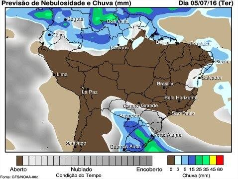 Já no restante do Brasil, o tempo seguirá aberto não só nessa terça-feira, mas ao longo de toda a semana. E esse padrão de tempo seco, permitirá que os trabalhos de colheita do milho 2ª safra, do café, da cana de açúcar, do algodão e de demais culturas possam transcorrer sem maiores transtornos ao longo desse período. Chuvas apenas sobre as faixas litorâneas do Nordeste e do Norte do Brasil.