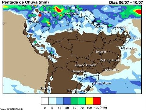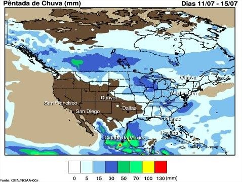 E nos Estados Unidos, as chuvas continuam a ocorrer em todo o meio-oeste americano, dando plenas condições ao desenvolvimento das lavouras de soja, milho, algodão e arroz. Apesar das chuvas, as temperaturas continuarão altas durante esses próximos 10 dias, o que pode ser um fator de perdas, já que os volumes de chuvas que estão sendo previstos não são altos e até mesmo em boa parte da faixa oeste dos Estados Unidos, não há previsões de chuvas para esses próximos 7 dias.