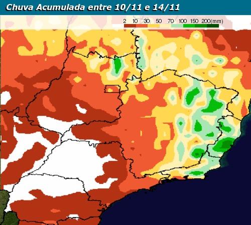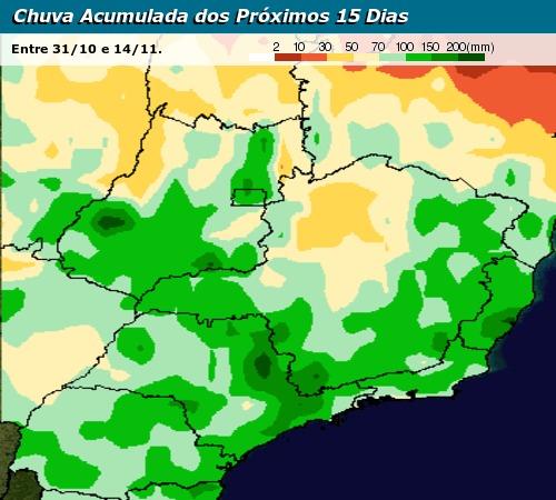 Os modelos numéricos de previsão do tempo indicam que o total de chuva acumulada sobre o Espírito Santo na primeira quinzena de Novembro pode superar 100mm, especialmente ao longo da costa. Eles indicam também que a chuva mais volumosa e persistente ocorrerá apenas a partir do período entre os dias 10 e 14/11, através de uma faixa de chuva persistente que abrange também o sul da Bahia, o norte de Minas Gerais e do Rio de Janeiro.