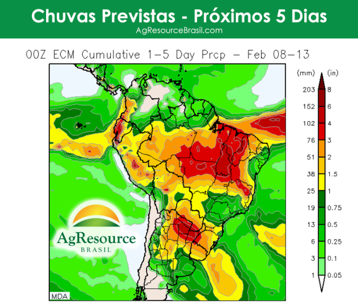 As previsões para os próximos 5 dias continuam oferecendo chuvas de alta intensidade, principalmente à região do MATOPIBA, Norte de Goiás e Mato Grosso e o Norte da Argentina. O padrão climático com chuvas mais amenas e irregulares previsto para a segunda metade de fevereiro começa a avançar sobre o Centro Oeste do Brasil. Se confirmado nos próximos dias, o "novo padrão" pode ter influência ativa nos totais pluviométricos a partir deste fim de semana.