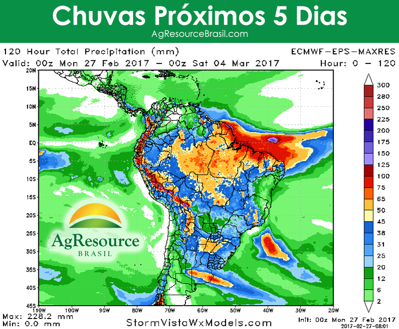 Essa semana as chuvas devem continuar sobre as mesmas regiões no Brasil e Argentina. O padrão estabelecido sobre a América do Sul deve perdurar até meados de março.