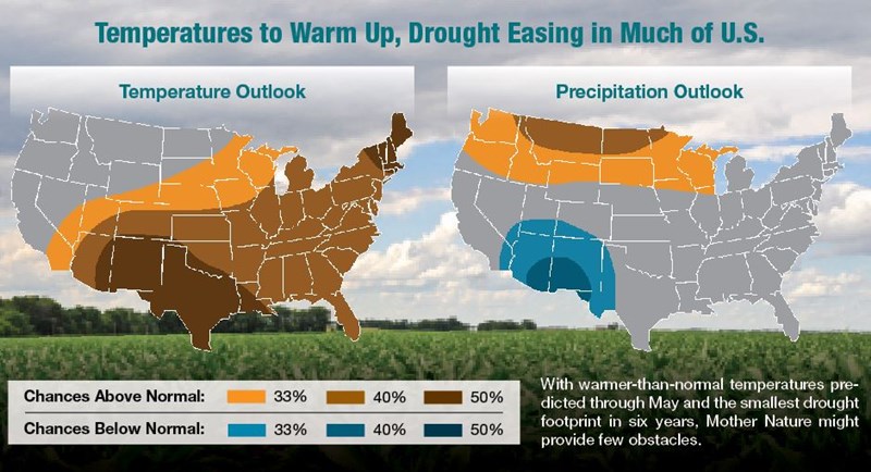 Segundo o meteorologista do portal norte-americano AgWeb, Mike Hoffman, a maior preocupação neste momento é o clima invernal que se estende até março. No entanto, diz que com a chegada do mês de abril, todo o país já poderá começar a registrar temperaturas acima da média. A previsão está em linha com o esperado pelo NOAA, o serviço oficial de clima norte-americano. A agência coloca uma boa faixa dos EUA com temperaturas elevadas além do 'normal' durante a primavera.