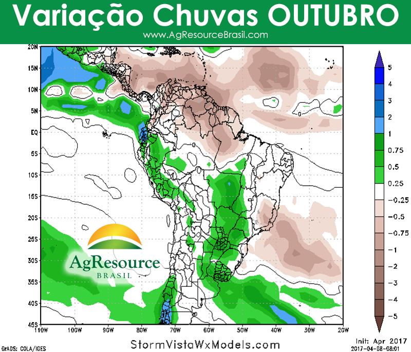Os mapas atualizados de longo prazo da AgResource Brasil já trazem leituras para o começo da safra 2017/18 na América do Sul. Segundo o modelo europeu de previsões (conhecido pela alta taxa de acertos), o começo do plantio no Centro Oeste e Sudeste do Brasil mostra um padrão mais “úmido” do que a média histórica (Normal Climatológica), representado pela cor “verde” no mapa.