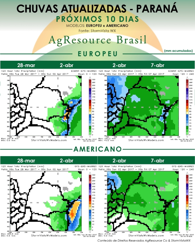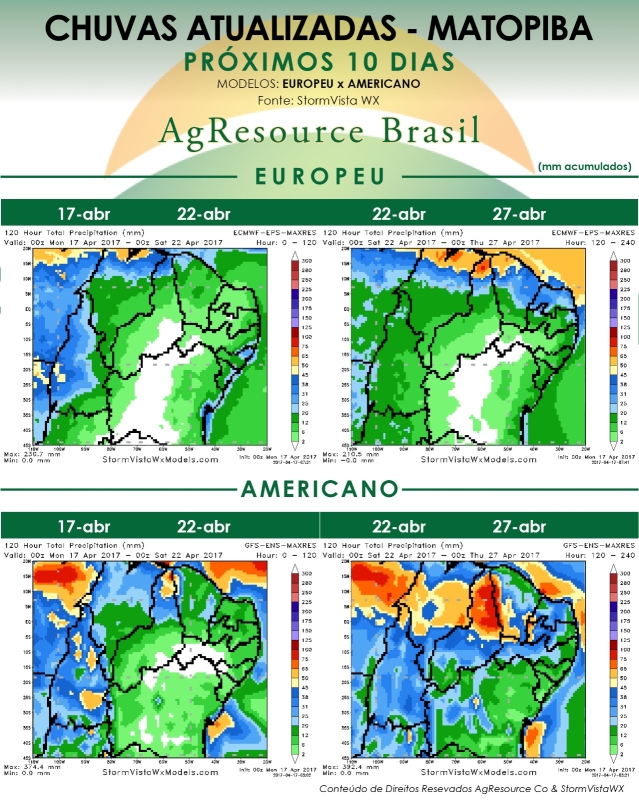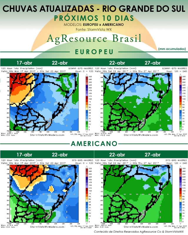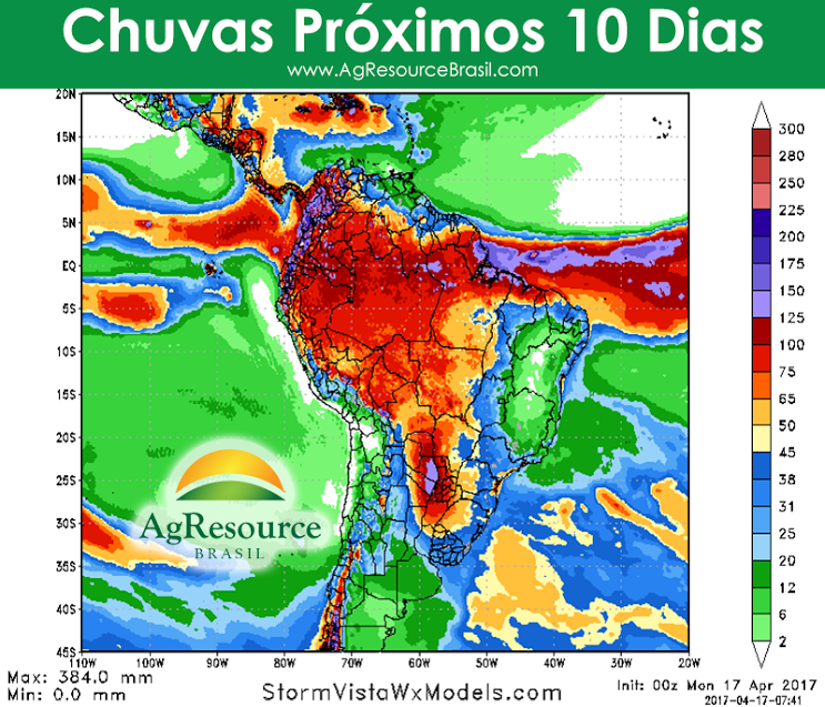 Na entrada da próxima semana, chuvas irão perdurar pelas mesmas regiões, entretanto diminuindo gradativamente a intensidade. Já na Argentina dias ensolarados e com chuvas isoladas e de baixa incidência deverão permitir um bom progresso da colheita no país, nos próximos 15 dias.