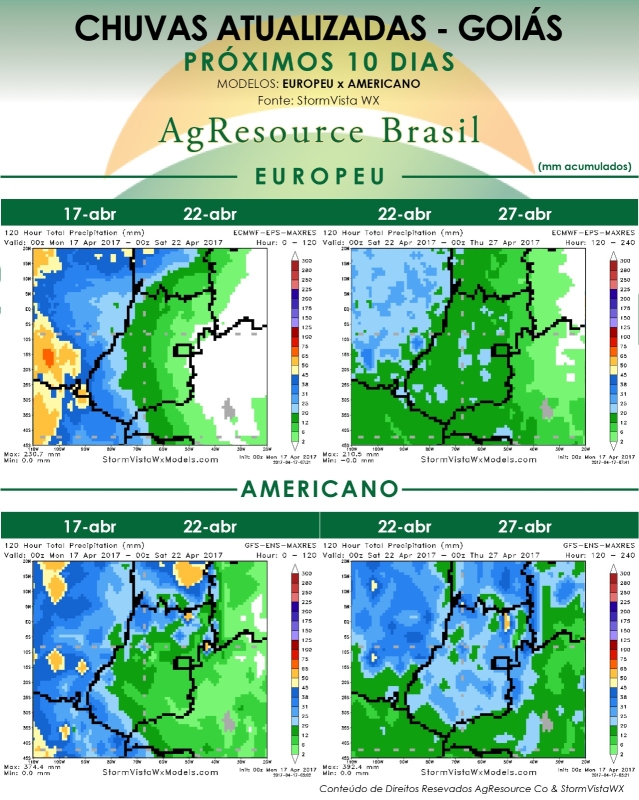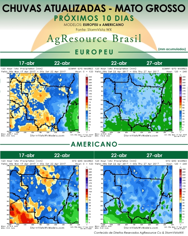 Chuvas generalizadas voltam ao Centro Oeste do Brasil e alivia os excessos na Argentina. As previsões climáticas atualizadas desta manhã trouxeram uma melhora substancial das previsões para as Américas do Sul e Norte. No Brasil, precipitações com alto índices pluviométricos voltam às regiões plantadas com safrinha, com as chuvas mais pesadas se concentrando ao lado oeste do país, nesta semana.
