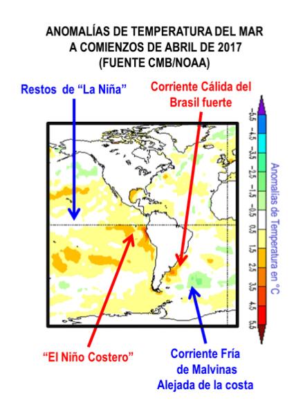 Durante março e abril, a corrente quente do Brasil superou, em forma tardia, a corrente fria das Malvinas, levando chuvas intensas sobre o sul da região dos pampas e provocando tempestades localizadas na costa patagônica.