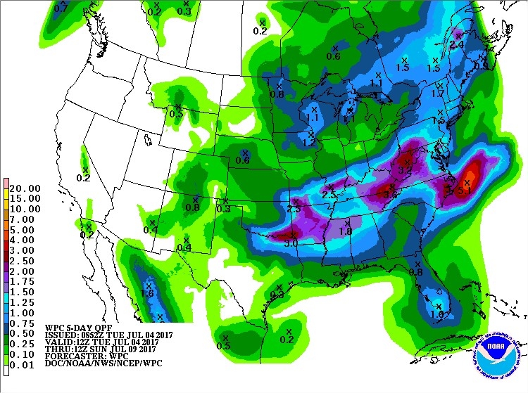 Previsão de chuvas para os próximos 5 dias nos EUA - Fonte: NOAA