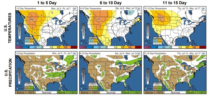 Os mapas da empresa são bastante semelhantes aos do NOAA, que mostram, nos períodos de 6 a 10 e de 8 a 14 dias, chuvas abaixo e temperaturas acima da média. As imagens a seguir trazerm as previsões para o intervalo de 10 a 16 de julho.