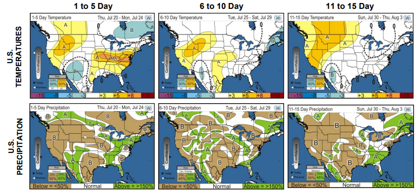 Há ainda picos de estresse em função do calor intenso previstos para 1/3 do milho do sudoeste do Meio-Oeste no resto da semana, com as temperaturas médias acima dos 32ºC, podendo chegar aos 37ºC.
