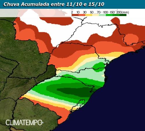 Veja o mapa de precipitação acumulada de 11/10 a 15/10 para o Sul do Brasil: