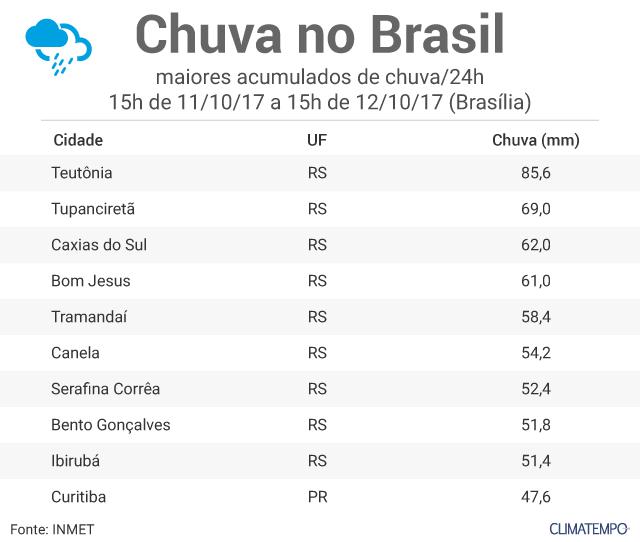 Veja os maiores acumulados de chuva de 11/10 a 12/10: