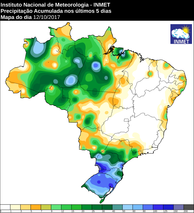 Veja o mapa de precipitação acumulada para todo o Brasil nos últimos cinco dias: