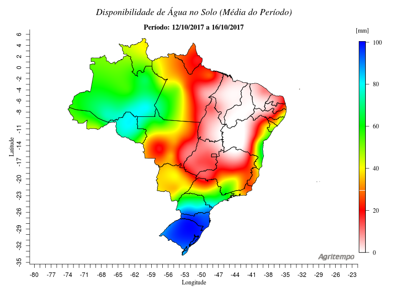 A disponibilidade de água no solo estava próxima de 40 milímetros na maioria das regiões do Centro-Oeste do Brasil de 12 a 16 de outubro, de acordo mapa da Agritempo, do Cepagri/Unicamp e Embrapa. (Veja o mapa abaixo) O calor forte impressiona na região, com informações de até 40ºC em algumas cidades, segundo o Inmet (Instituto Nacional de Meteorologia). Essas condições têm limitado o plantio da safra 2017/18 de soja do Brasil e milho, que tem área reduzida nesta temporada.