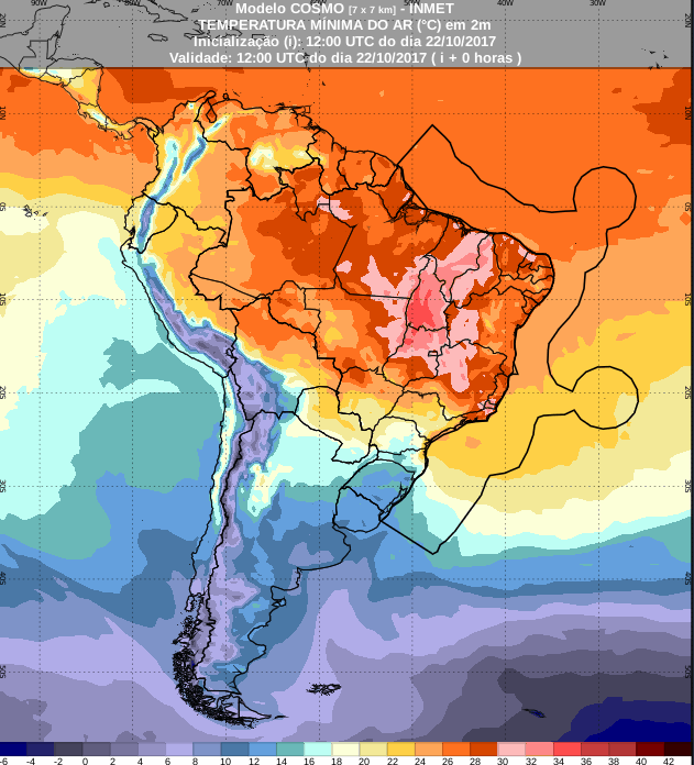 Veja o mapa com a previsão de temperatura mínima para até 9 horas (19/10 a 25/10) para todo o Brasil: