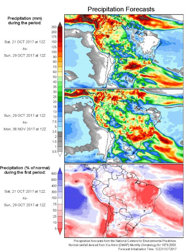 Enquanto o frio chega ao Sul, as instabilidades que provocavam chuva na região avançam pelo Brasil central, conforme reportado na semana passada. Por enquanto, no final de semana, as precipitações estiveram mais concentradas no Sudeste, em áreas de São Paulo, Rio de Janeiro e Minas Gerais e no Centro-oeste. No decorrer da semana, a frente fria percorre o país com bons acumulados e forças para amenizar as preocupações pré-plantio da safra 2017/18 de grãos.