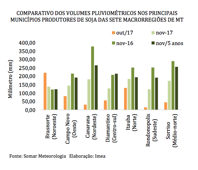Apesar das recentes chuvas no Centro-Oeste do Brasil, o plantio no Mato Grosso tem sido bastante heterogêneo e a tendência para novembro é de precipitações abaixo da média dos últimos cinco anos em algumas regiões do estado, segundo o Imea (Instituto Mato-grossense de Economia Agropecuária) com base nas previsões da Somar Meteorologia. Essas condições e previsões têm preocupado os produtores, apesar de um avanço de cerca de 18 pontos percentuais de uma semana para a outra na semeadura da oleaginosa no maior estado produtor.
