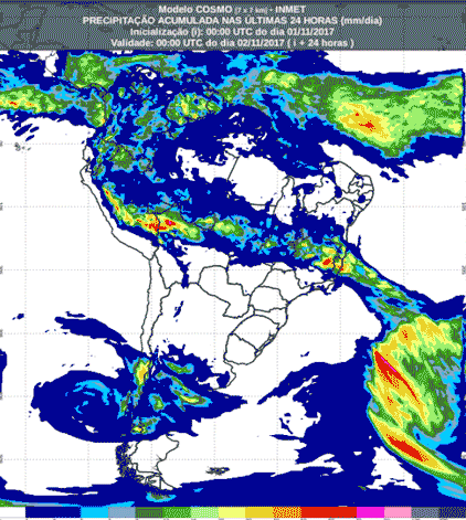 Mapa com a previsão de precipitação acumulada para até 174 horas (02/11 a 08/11) para todo o Brasil - Fonte: Inmet