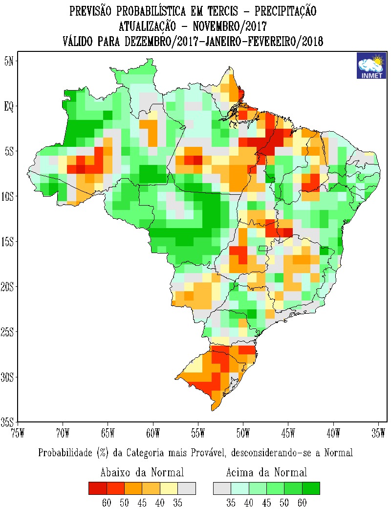Veja a previsão probabilística da precipitação no Brasil nos próximos três meses