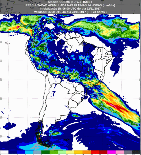 Veja o mapa com a previsão de precipitação acumulada para até 72 horas (23/11 a 25/11) para todo o Brasil:
