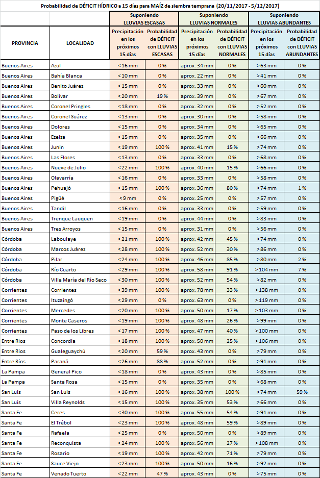 O ORA aponta que as reservas de água no solo, supondo o consumo médio de um milho de janela precoce, estão dentro de um cenário de reservas regulares, com uma ampliação das zonas escassas de água e alguns focos de seca nos departamentos de Río Cuarto e Juárez Celman.