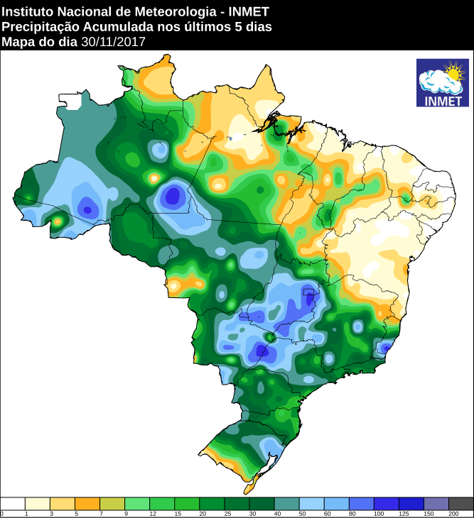 Veja o mapa de precipitação acumulada nos últimos cinco dias em todo o Brasil: