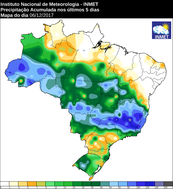 Veja o mapa de precipitação acumulada nos últimos cinco dias em todo o Brasil: