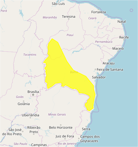 "Chuva entre 20 a 30 mm/h ou até 50 mm/dia. Baixo risco de alagamentos e pequenos deslizamentos, em cidades com tais áreas de risco", comunica o instituto em relação ao estado da Bahia. Em Minas, as condições serão parecidas, mas também há previsão de ventos intensos, de 40 a 60 km/h. (Veja abaixo as áreas que podem ser afetadas)