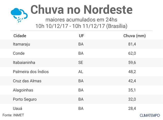 De acordo com informações da Climatempo, já tem chovido bastante na Bahia desde o fim de semana. Em 24 horas, nos dias 10 e 11 de dezembro, choveu quase 100 milímetros em algumas cidades. Itamaraju (BA) registrou o maior volume com 81,4 mm, segundo dados do Inmet. No mesmo período, choveu 62 mm em Conde (BA), 42,4 mm em Cruz das Almas (BA), 35,1 mm em Alagoinhas (BA) e 32 mm em Porto Seguro (BA).