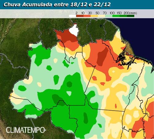 No período de 18 a 22 de dezembro, são esperados acumulados de até 100 milímetros em diversos estados da região Norte. (Veja o mapa abaixo) A chuva poderá ser forte e causar transtornos em algumas cidades. "O tempo fica muito instável em quase toda a Região Norte nos próximos dias e a chuva vai cair forte e volumosa sobre vários estados. Só Roraima ficará fora da área de temporais", noticiou a Climatempo.