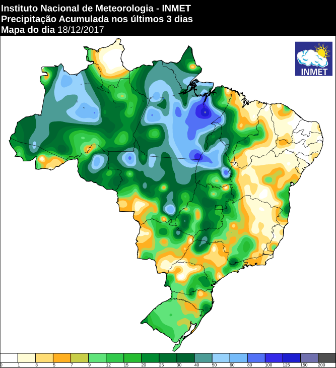 Veja o mapa de precipitação acumulado dos últimos três dias em todo o Brasil: