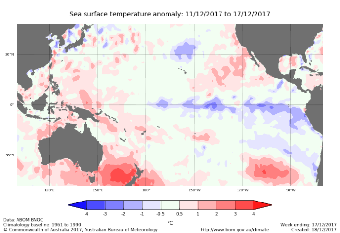 O serviço australiano de meteorologia, Bureau of Meteorology (BOM, na sigla em inglês), reforçou em informativo divulgado nesta terça-feira (19) a incidência do fenômeno climático La Niña e sua persistência para até o início do outono de 2018 no hemisfério Sul. Os modelos climáticos, no entanto, seguem apontando que o evento será fraco e de curta duração.