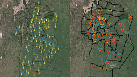 Até o meio dia, as zonas mais produtivas de Córdoba, ou seja, os departamentos do sul e do sudeste, receberam entre 10mm e 30mm, de acordo com um levantamento realizado pelo site Agrovoz a partir dos dados publicados pelas redes de estações meterológicas da Bolsa de Cereais de Córdoba, do Ministério de Agricultura e Pecuária e do Instituto Nacional de Tecnologia Agropecuária (Inta).