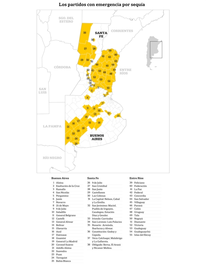 No caso de Buenos Aires, a comissão de emergência da província declarou a emergência para 27 municípios, que envolvem 3,5 milhões de hectares, aguardando a assinatura da governadora, María Eugenia Vidal. Córdoba e La Pampa também devem realizar suas declarações.