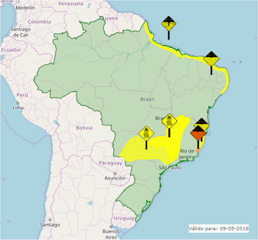 São esperados altos acumulados, de até 50 milímetros no dia, em áreas próximas ao litoral de Alagoas, Ceará, Espírito Santo, Paraíba, Pernambuco, Piauí e Rio Grande do Norte. Já em localidades dos estados do Amapá, Maranhão e Pará as chuvas serão intensas, também com até 50 mm/dia e ventos fortes.