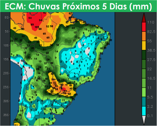 "Para os próximos 5 dias, as chuvas continuam concentradas no lado sul do Mato grosso do Sul, juntamente com uma expansão da área regada sobre o Paraná, Santa Catarina e norte do Rio Grande do Sul. Os índices pluviométricos são previstos num raio de 30-60mm acumulados no período", complementa.