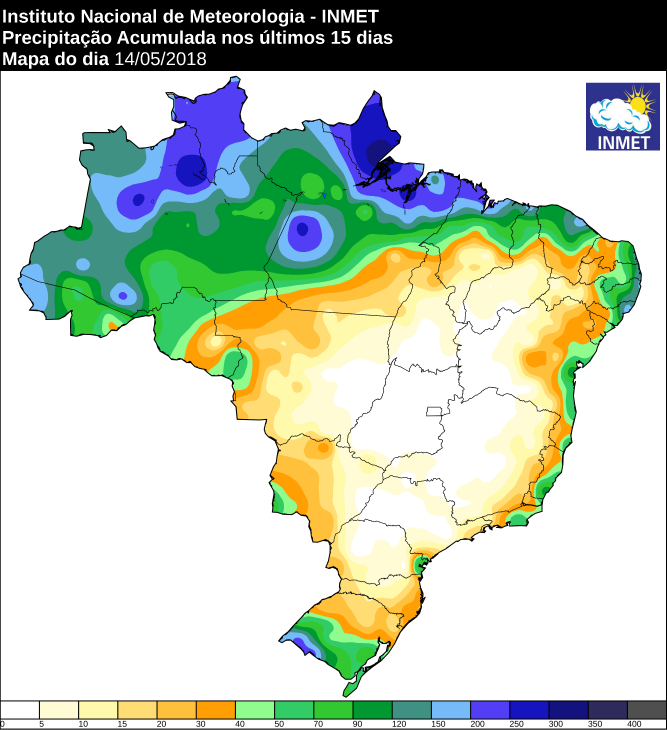 Mapa com precipitação acumulada nos últimos 15 dias em todo o Brasil - Fonte: Inmet