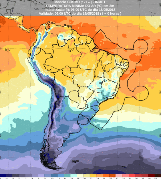 "O amanhecer do domingo (20/05) será de muito frio na Região Sul, Mato Grosso do Sul, São Paulo e sul de Minas Gerais, com formação de geada ampla no Sul do país. Nas demais áreas do Sudeste, Centro-Oeste e sul da Região Norte, o frio vai ganhando força no decorrer do domingo, apesar do predomínio de sol nestas áreas destaca-se que a tarde será fria", disse o Inmet em nota na última quinta-feira.