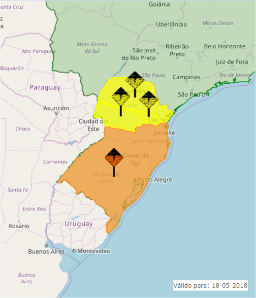 O Inmet (Instituto Nacional de Meteorologia) alerta para o perigo potencial das tempestades em áreas ao Norte do Paraná e nas proximidades da capital Curitiba (PR). Os acumulados diários podem chegar a até 50 milímetros com ventos intensos (40-60 Km/h) e há possibilidade de queda de granizo. Em diversas outras áreas da região Sul as chuvas serão intensas.