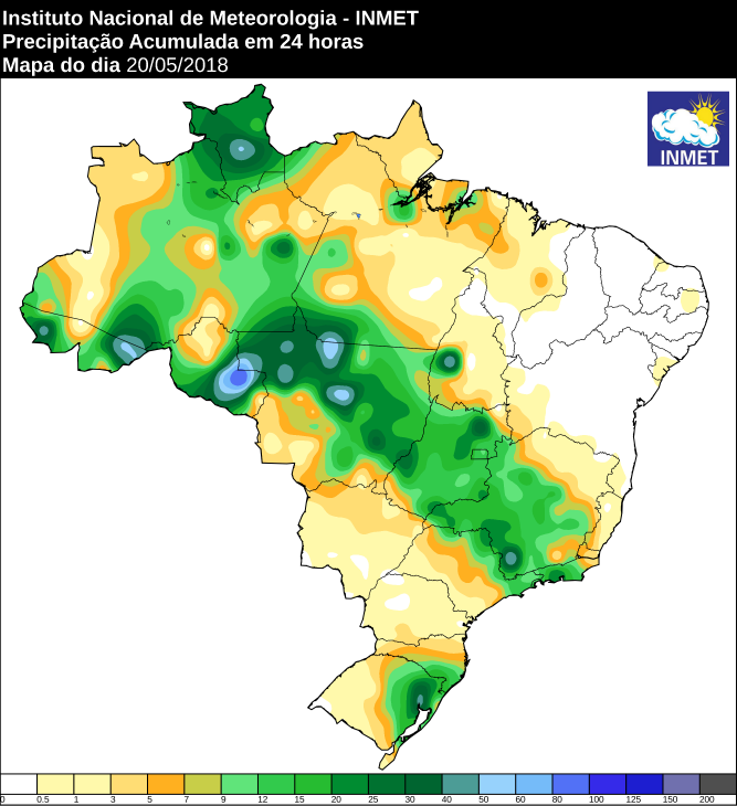 Veja o mapa com a precipitação acumulada em todo o Brasil nas últimas 24 horas: