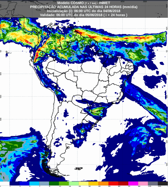 Veja o mapa com a previsão de precipitação para até 72 horas (05/06 a 07/06) em todo o Brasil: