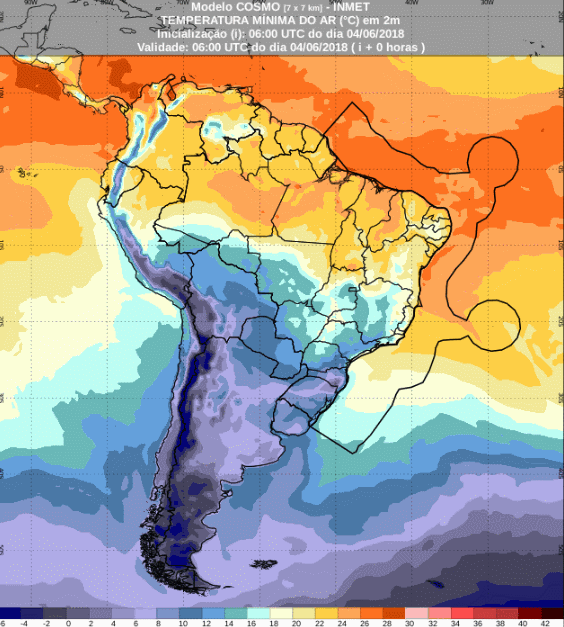Veja o mapa com a previsão de temperaturas mínimas para até 60 horas (04/06 a 06/06) em todo o Brasil: