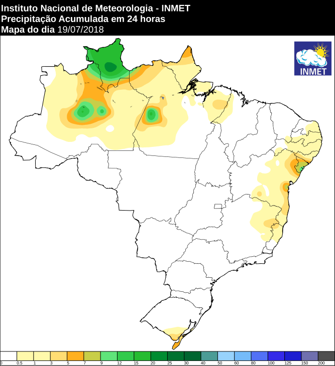 Veja o mapa das áreas com precipitação acumulada nas últimas 24 horas em todo o Brasil: