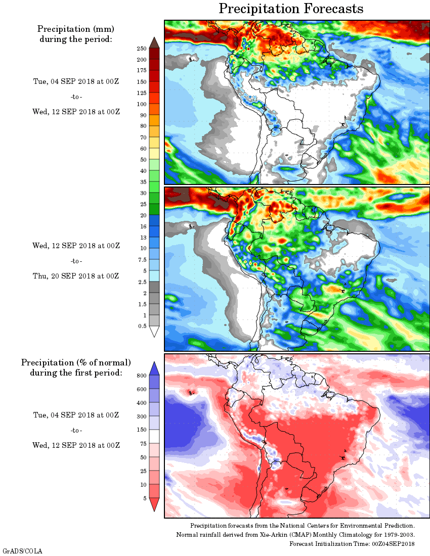 Mapas estendidos do centro de previsão da Administração Oceânica e Atmosférica Nacional (NOAA, na sigla em inglês), nos Estados Unidos, mostram volume praticamente zerado de chuva sobre o Brasil central no período de 4 a 12 de setembro. As precipitações ficam mais concentradas sobre a região Sul, mas ainda com baixos volumes acumulados. De 12 a 20 de setembro, mais chuvas aparecem no radar.