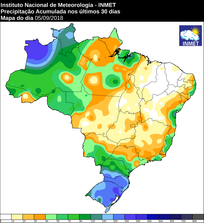 Veja o mapa de precipitação acumulada nos últimos 30 dias em todo o Brasil: