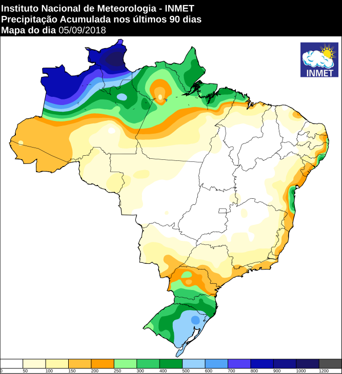 Veja o mapa de precipitação acumulada nos últimos 90 dias em todo o Brasil: