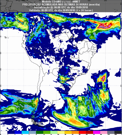 De acordo com dados levantados pelo Inmet, os cinco maiores acumulados de chuva nesta terça-feira (18) no país foram em Canarana (MT): 50 mm, Nova Xavantina (MT): 43,6 mm, Três Rios (RJ): 35,0 mm, Vacaria (RS): 33,6 mm e Bom Jesus (RS): 32,9 mm.