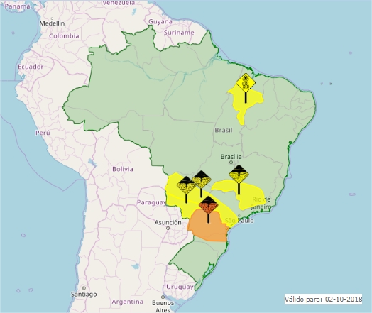 Já no Mato Grosso do Sul e São Paulo, as chuvas tendem a ser mais brandas ao longo do dia. São previstas precipitações entre 20 e 30 mm/h ou até 50 mm/dia, ventos intensos (40-60 Km/h), e queda de granizo. É baixo o risco de corte de energia, estragos em plantações, queda de galhos de árvores e de alagamentos.