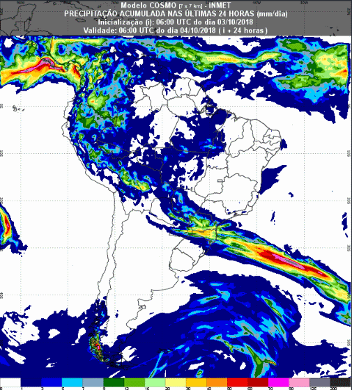 Mais chuvas são esperadas na região Sul nos próximos dias, conforme mostra o modelo Cosmo. "A instabilidade irá manter o solo com bons níveis de umidade e favorecer o desenvolvimento das lavouras que estão em fase de desenvolvimento. Por outro lado, a chuva irá impossibilitar todas as atividades de campo", disse a Climatempo.